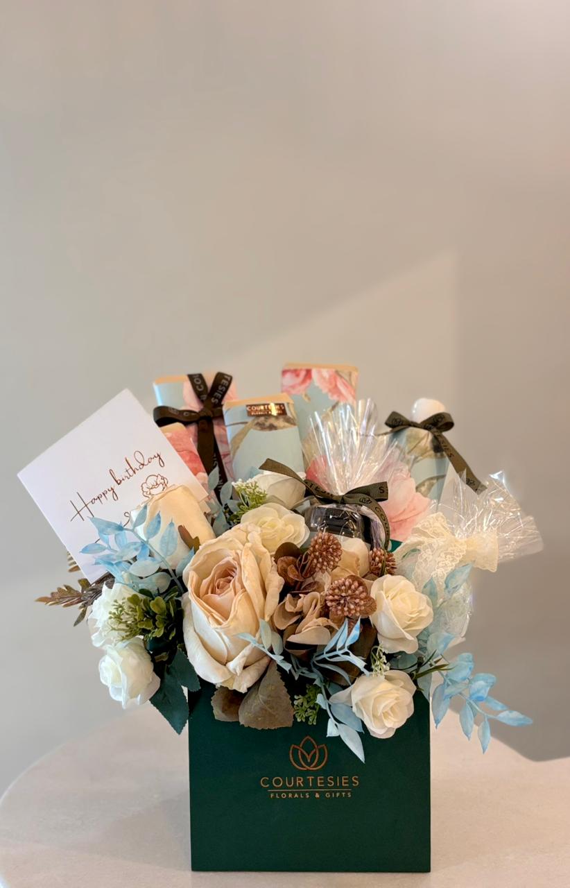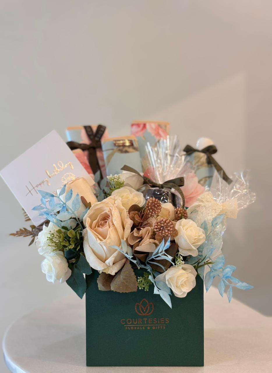 A “Happy Birthday” card, Assorted Courtesies gift boxes, Wrapped premium chocolates, Faux roses and mixed florals, And decorative ribbons and packaging.